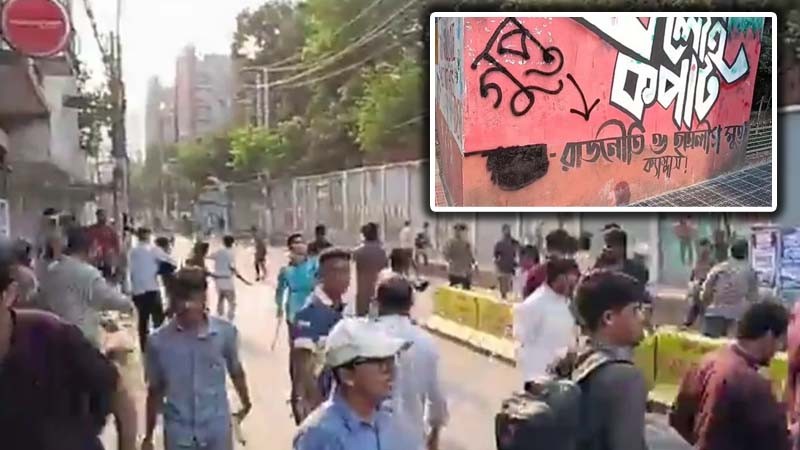 গ্রাফিতির নিচে লেখা একটি বাক্য থেকে ‘ছাত্র’ মুছে ‘গুপ্ত’ লিখে দেন ছাত্রদলের নেতা–কর্মীরা।