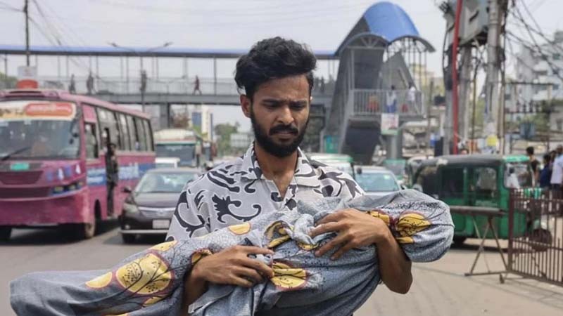 রাজধানীর মহাখালী এলাকায় ফুটওভার ব্রিজ পার হয়ে কোলে শিশুর নিথর দেহ নিয়ে হাঁটছেন এক যুবক- এমন একটি হৃদয়বিদারক দৃশ্য সামাজিক যোগাযোগমাধ্যমে ছড়িয়ে পড়ে।
